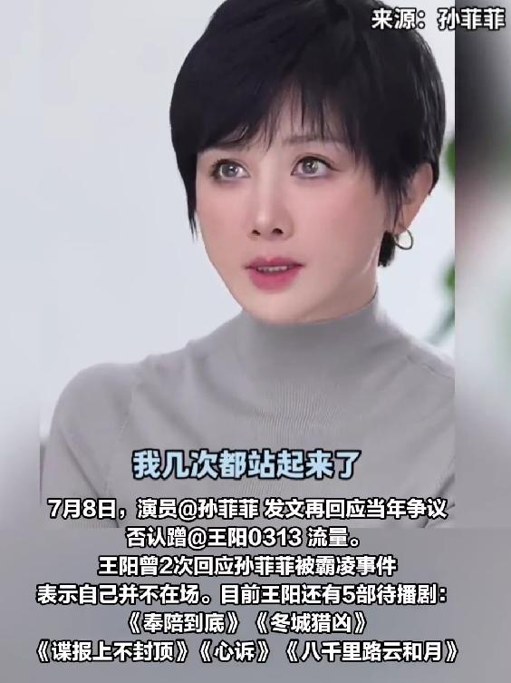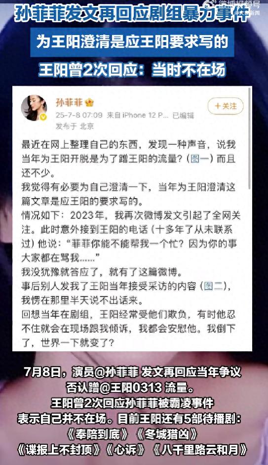 孫菲菲在評(píng)論回復(fù):“王陽(yáng)當(dāng)時(shí)不在現(xiàn)場(chǎng),大家不要為難他。”2025年7月,孫菲菲再發(fā)文稱(chēng)王陽(yáng)當(dāng)時(shí)雖然沒(méi)在現(xiàn)場(chǎng),但實(shí)際情況他是知道的,因?yàn)楫?dāng)時(shí)打完我戲還沒(méi)拍完,還有八場(chǎng)戲。截至目前,王陽(yáng)方未回應(yīng)此事