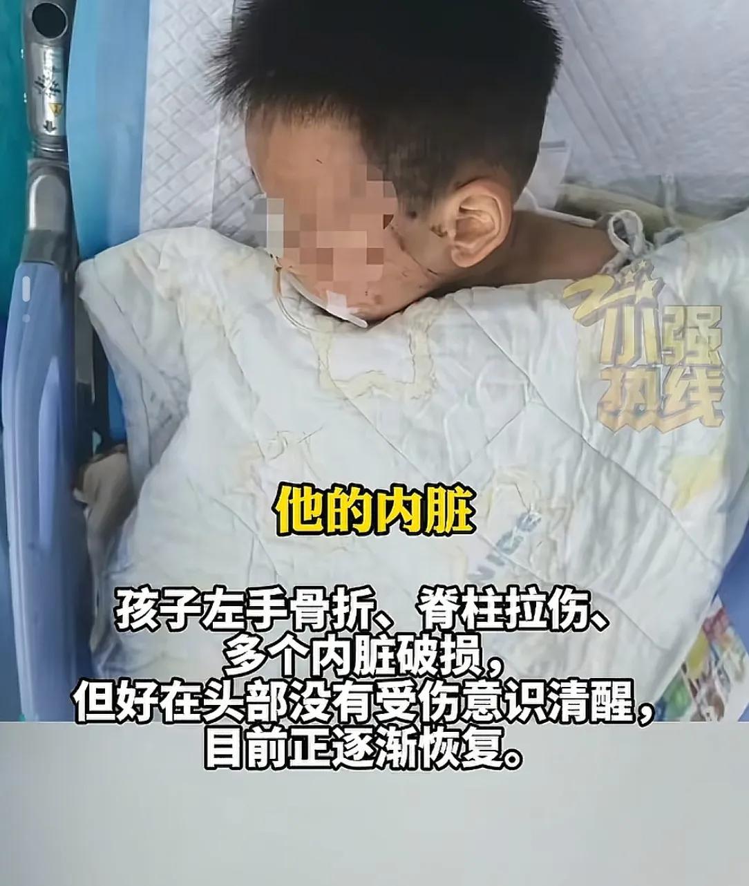 小孩被送進醫院檢查后發現,身上有很多處劃傷,左手骨折,脊柱拉傷、多個內臟破損,小孩爸爸說基本每個內臟都有不同程度的受損,但好在頭部沒有受傷意識清醒。