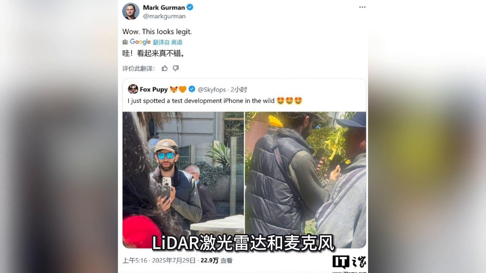 之家7月29日消息,科技媒體MacRumors分享了來(lái)自Skyfops在戶(hù)外抓拍的超震撼圖片。照片里一個(gè)戴反射太陽(yáng)鏡的神秘人手里拿著被厚黑色保護(hù)殼包裹的手機(jī),Pro大概率就是iPhone17Pro,旁邊還拿著貼標(biāo)簽的iPhone16Pro。從曝光的圖片能看出不少猛料。