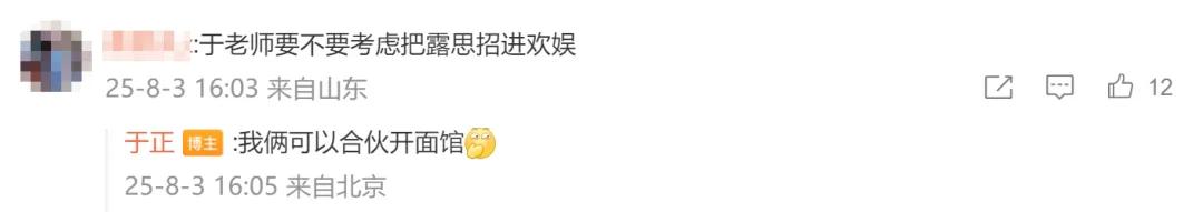 知名編劇于正在其個人微博評論區就趙露思的相關熱搜回復網友稱:“我倆可以合伙開面館”。