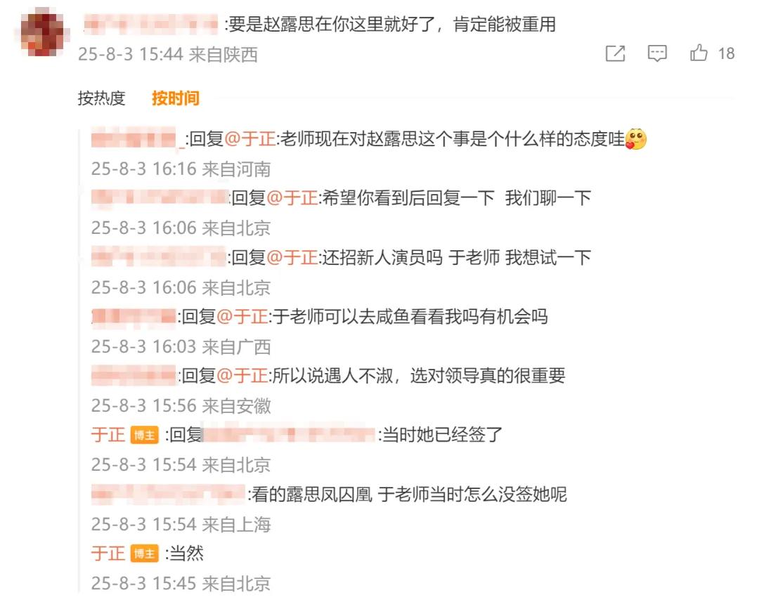 有網友給于正留言稱“要是趙露思在你這里就好了,肯定能被重用”,于正回復“當然”,并在回復“于老師當時怎么沒簽她”時表示“當時她已經簽了”。