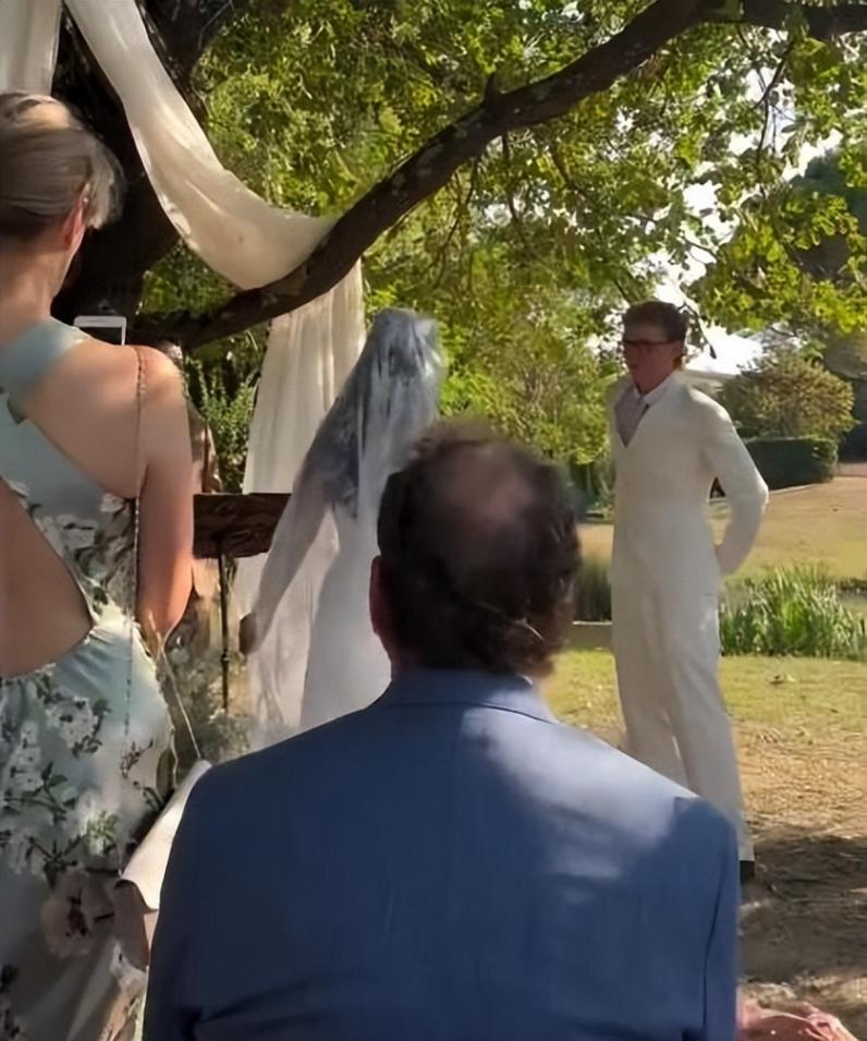 婚禮地點是個莊園,布置簡單,就二三十個客人,牧師宣布新娘入場,桑德琳先陪女兒走一段,然后把姜一郎交給姜文,由他挽著女兒走向新郎。這場面挺罕見,因為姜文和桑德琳離婚快20年了,這次同框,沒啥尷尬,桑德琳穿黑色深V禮服,身材保持得不錯,姜文則是一身藍色襯衫白褲子,戴墨鏡,看起來酷勁十足。姜一郎穿白婚紗,頭紗蓋著,整體從簡,沒啥浪漫法式風情,就跟普通人結婚似的。