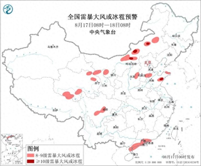 預計8月17日8時至18日8時,內蒙古中東部、西北地區中部、華北中南部、黃淮北部、西南地區北部、華南南部等地的部分地區將有8級以上雷暴大風或冰雹天氣,其中,內蒙古中部、山東中東部等地的部分地區將有10級以上雷暴大風;內蒙古中部和東部、西北地區中部、華北中南部、黃淮北部、西南地區北部、華南南部等地的部分地區將有小時雨量大于20毫米的短時強降水天氣,其中,河北南部、山東北部和東部等地的部分地區小時雨量大于50毫米,最大可達70毫米以上。