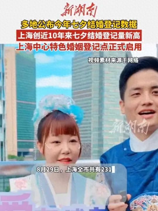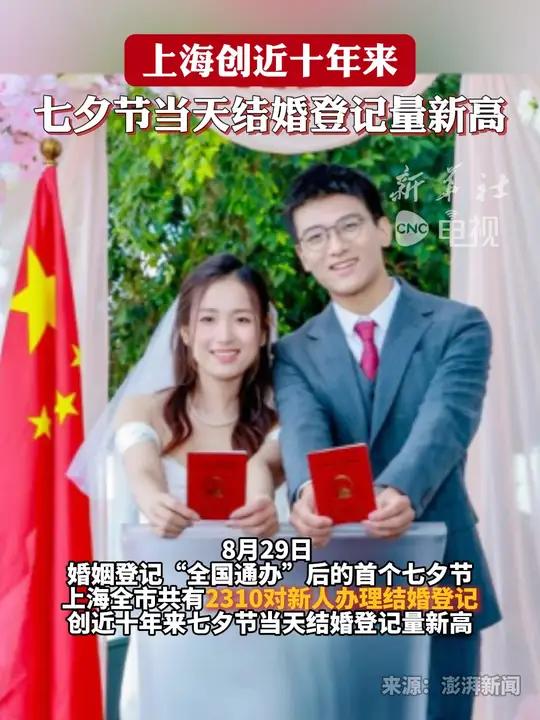 8月29日七夕節,全國民政局集體變身"愛情收費站",上海2310對新人扎堆領證,創下十年新高;新疆賽里木湖登記點凌晨就排起長龍,深圳讓機器人當證婚人,新人拍賽博朋克婚紗照,這場全國通辦后的首個七夕,直接把結婚登記整成大型"愛情趕集"現場。