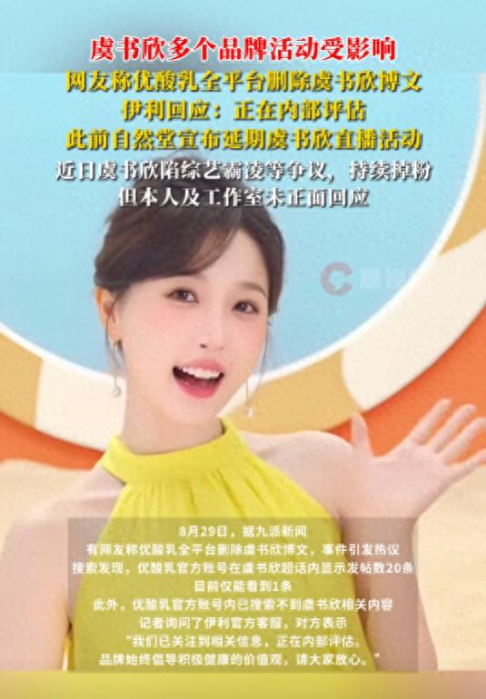 8月29日,據九派新聞,有網友稱優酸乳全平臺刪除虞書欣博文,事件引發熱議。搜索發現,優酸乳官方賬號在虞書欣超話內顯示發帖數20條,目前僅能看到1條。