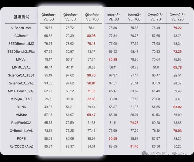 在通用能力基準測試中,Qianfan-VL 系列模型(3B、8B、70B)展現出顯著核心優勢。