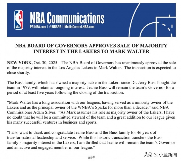10月31日訊 NBA今日官宣,NBA理事會一致同意,批準馬克-沃爾特以多數股權收購湖人,交易預計將在近期完成!