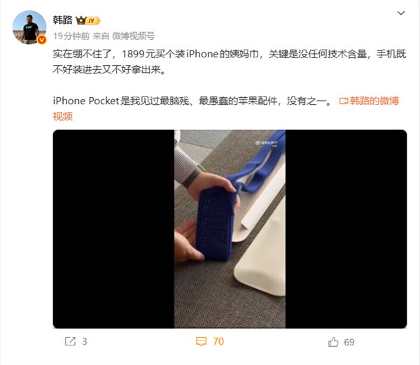 11月15日消息,"iPhone Pocket是我見過最腦殘、最愚蠢的蘋果配件,沒有之一。"汽車博主韓路今天給出了毫不留情的評價。