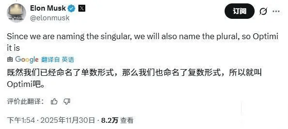 IT之家注意到,在 X 平臺上圍繞 Optimus 展開的討論中,一位用戶向這位 CEO 提問:這種人形機器人的復數形式應如何表達?馬斯克回應稱,既然特斯拉公司為該機器人確定了單數名稱“Optimus”,那么其復數形式也應由公司來定義。“既然我們命名了單數形式,那復數形式也由我們來定,就叫‘Optimi’吧。”他在 X 上的回復中寫道。