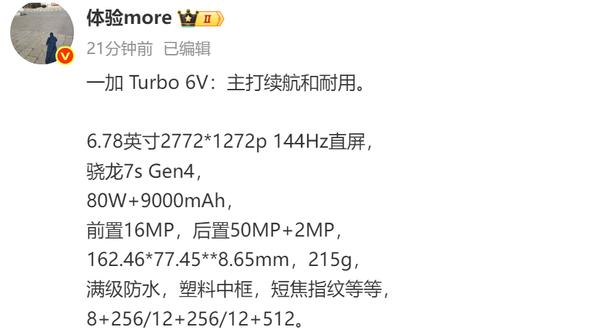 根據曝光信息,一加Turbo 6V配備一塊6.78英寸直屏,分辨率為2772×1272像素,支持144Hz高刷新率。核心性能方面,該機搭載高通驍龍7s Gen4移動平臺,雖非旗艦級芯片,但針對日常使用和能效優化進行了調校,契合其長續航定位。